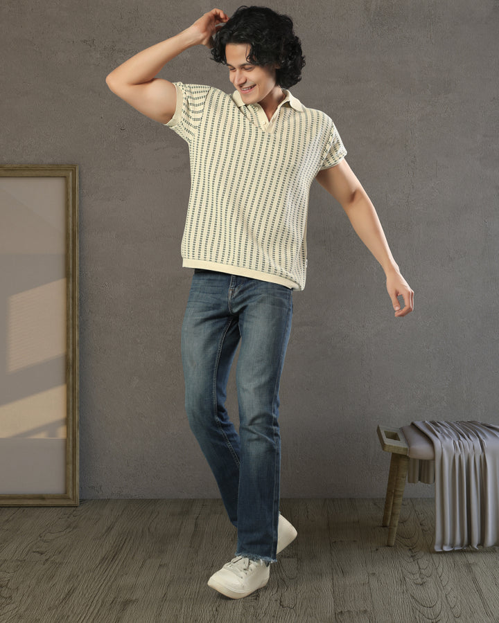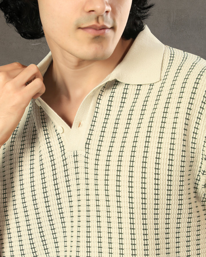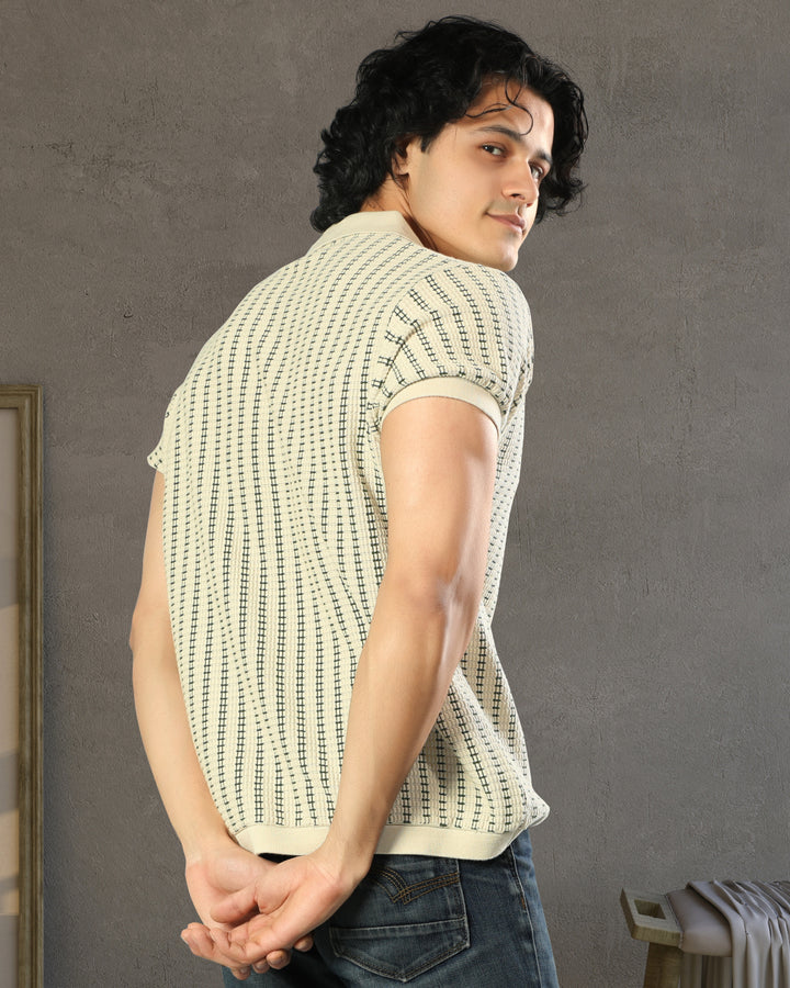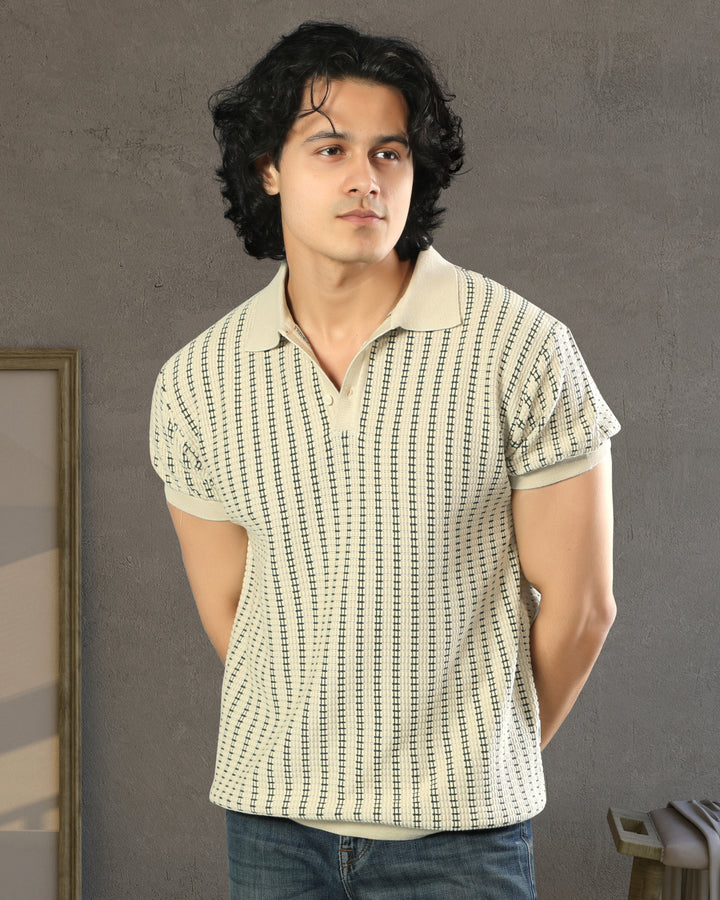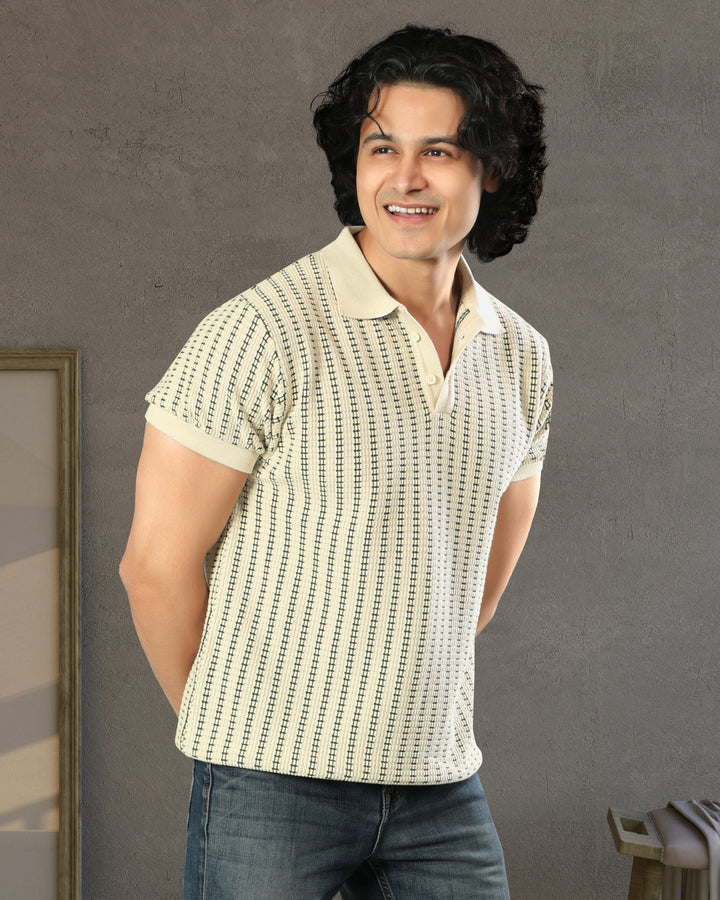 Redefine casual sophistication with this Grid Knit Beige Polo T-shirt. Designed in a breathable textured knit, it features a refined grid pattern that adds depth and character to your everyday style. The soft cotton fabric ensures comfort, while the slim fit and classic collar deliver a polished yet effortless look. Perfect for brunches, workdays, or evening plans.