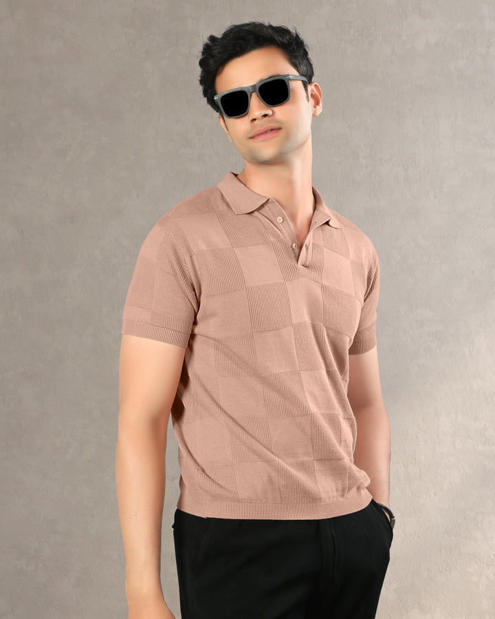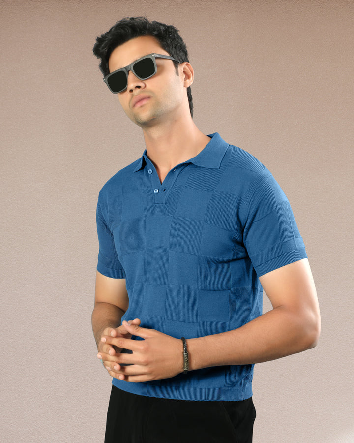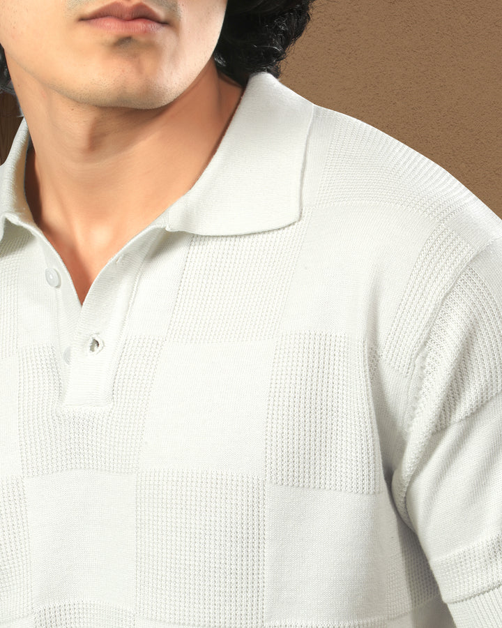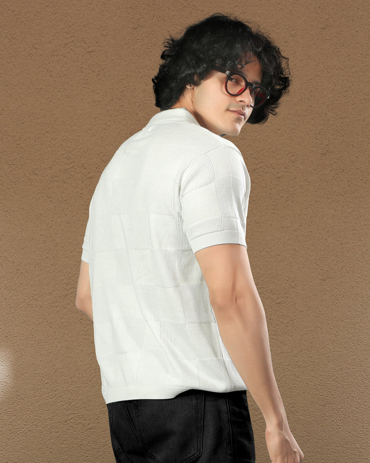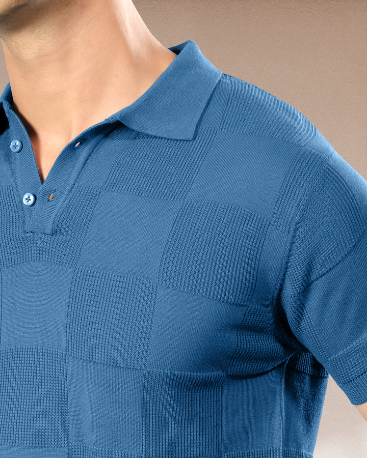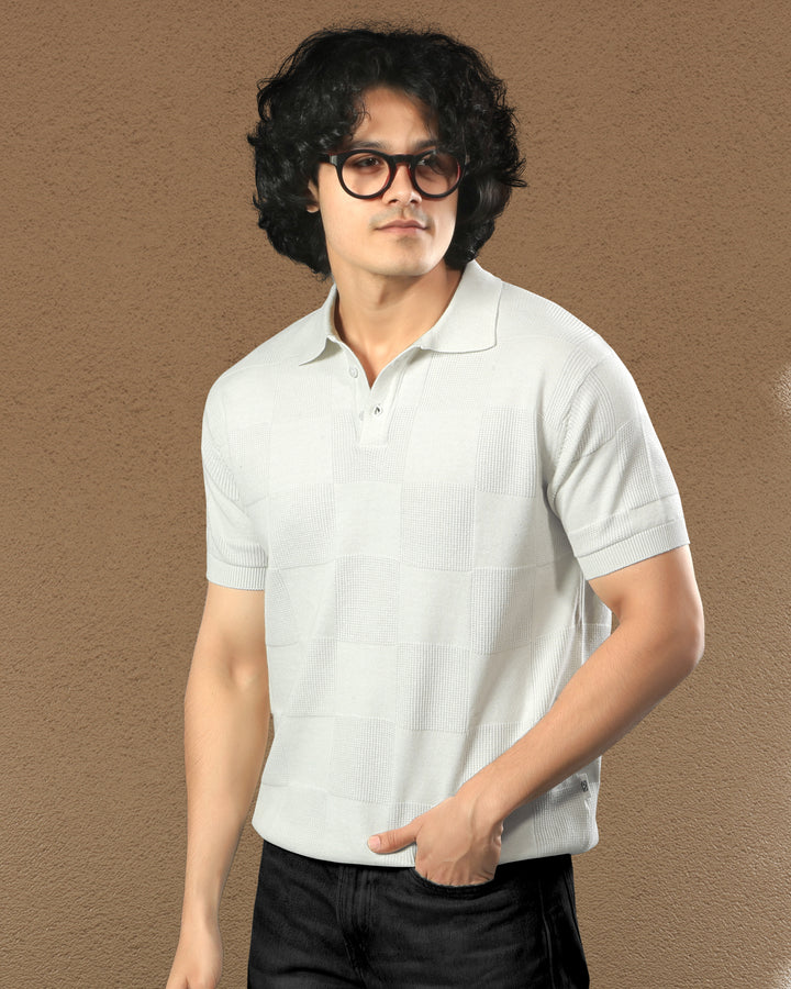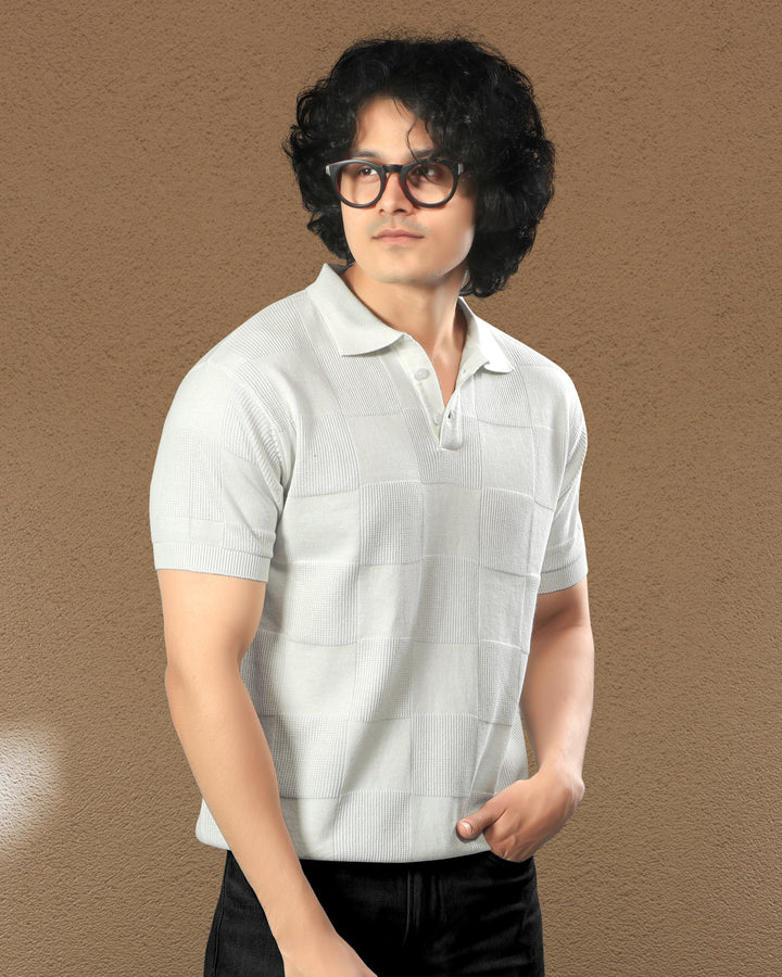 A modern twist on the Square Textured Grid Knit Polo T-shirt combines structure and comfort effortlessly. Featuring a subtle checkered knit pattern, this polo is crafted from a soft, breathable cotton blend that offers stretch and shape retention. Perfect for smart-casual settings, it delivers a refined look whether styled with tailored trousers or dark denim.