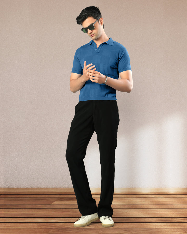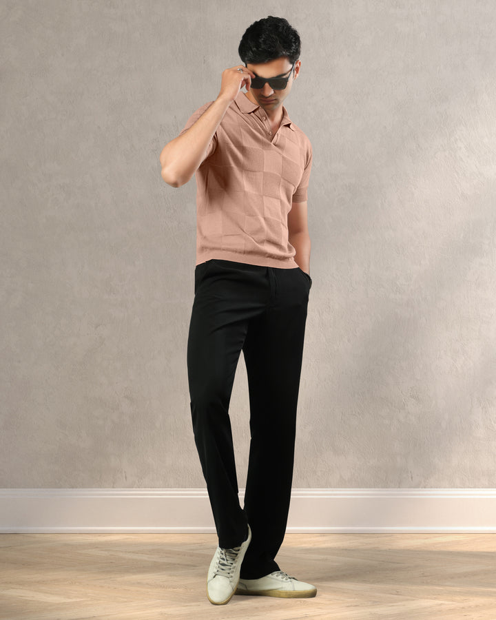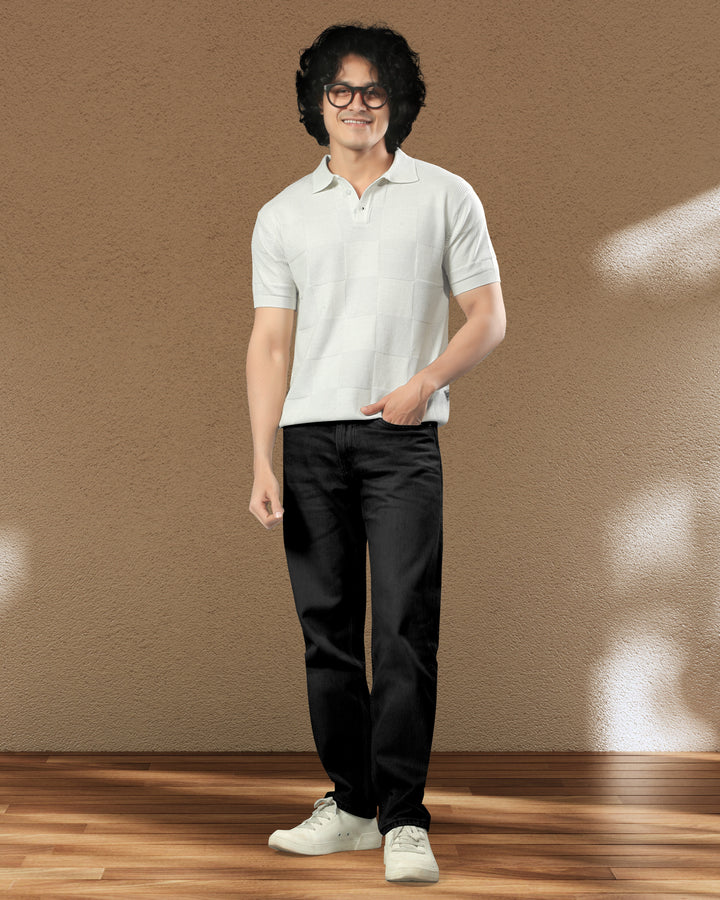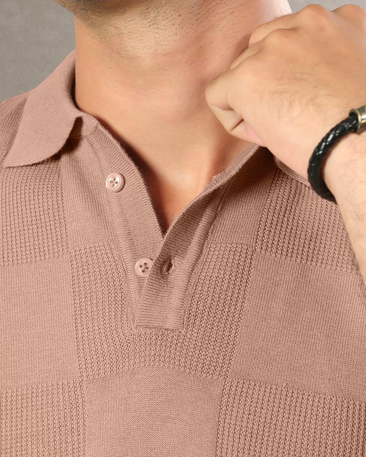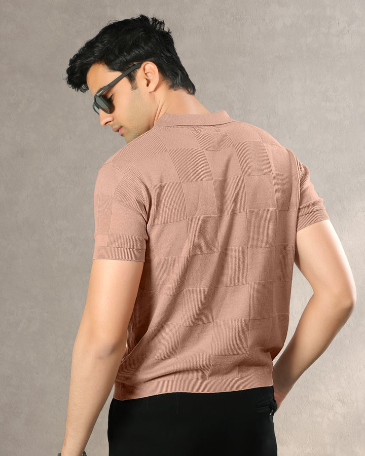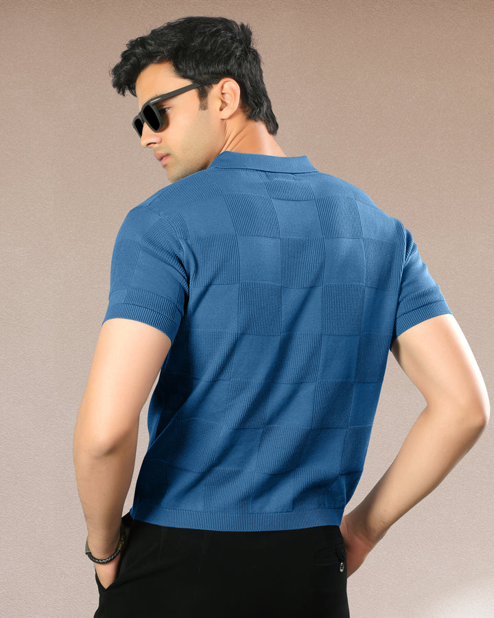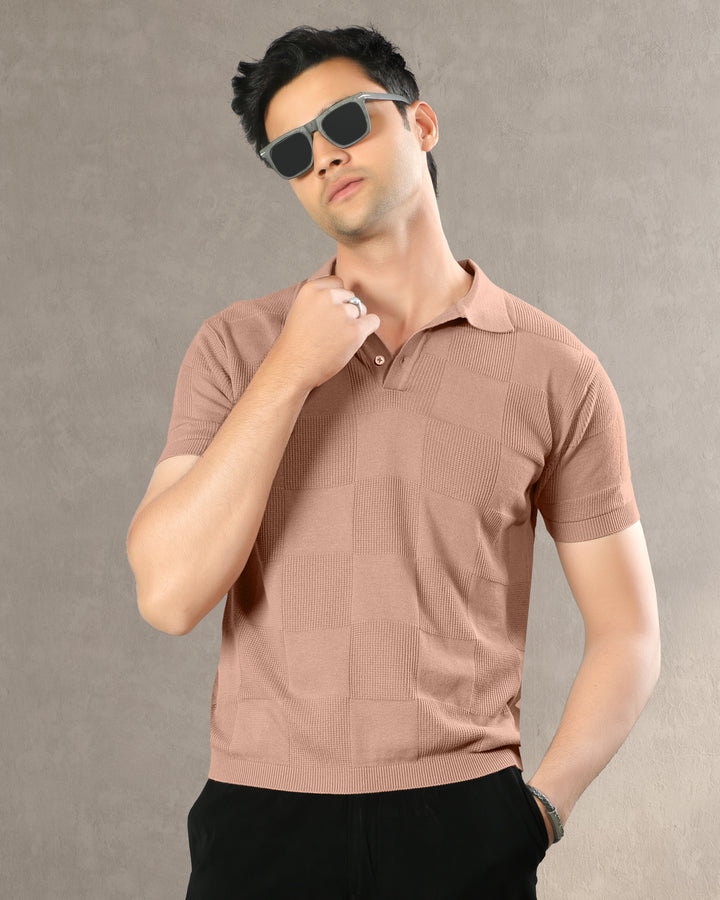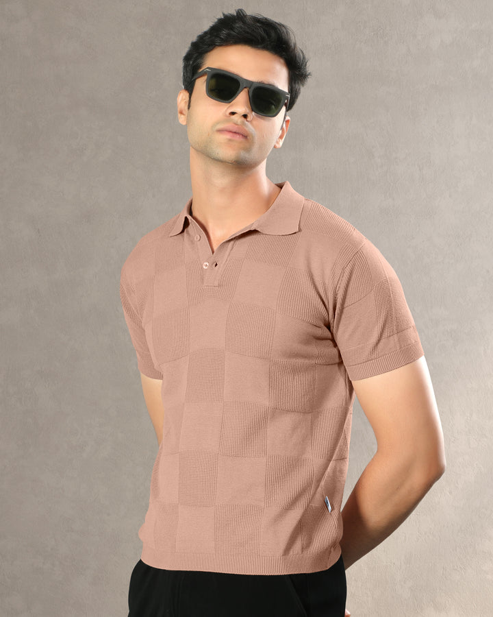 A modern twist on the Square Textured Grid Knit Polo T-shirt combines structure and comfort effortlessly. Featuring a subtle checkered knit pattern, this polo is crafted from a soft, breathable cotton blend that offers stretch and shape retention. Perfect for smart-casual settings, it delivers a refined look whether styled with tailored trousers or dark denim.